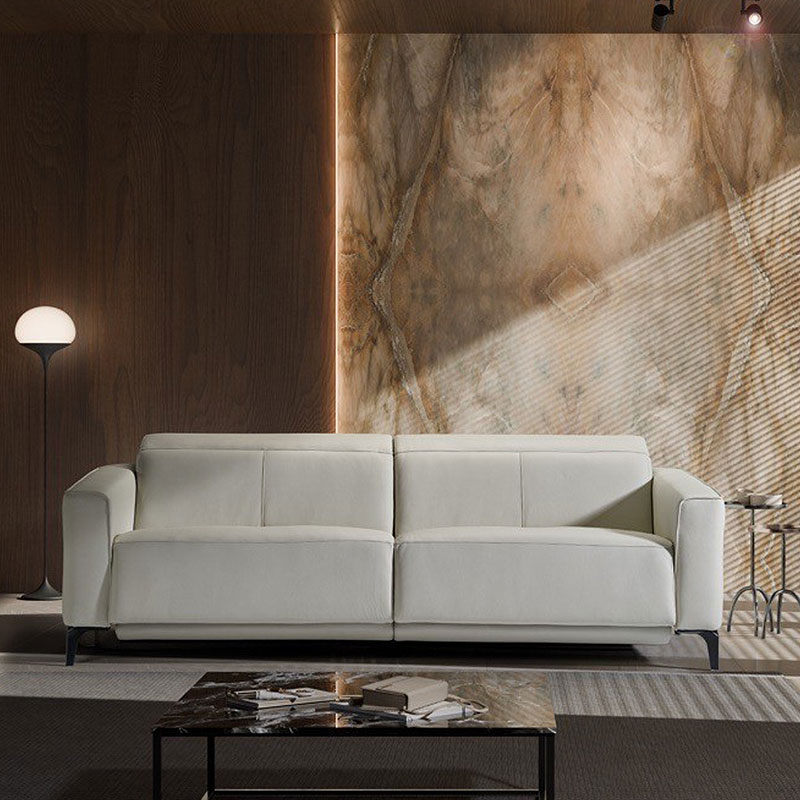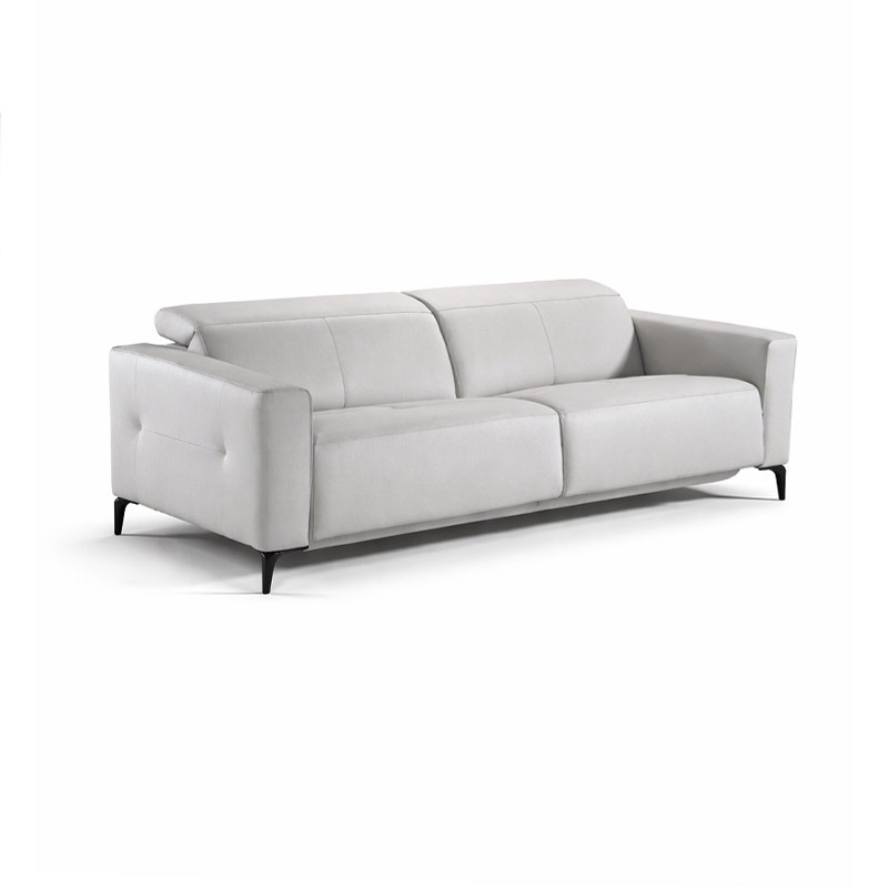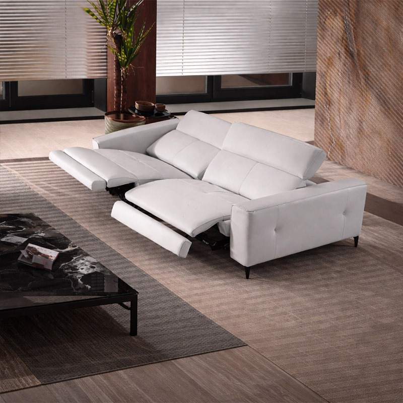 Sofá relax eléctrico de fondo reducido a 96cm, sistema cardio system elevación piernas, cabezal multipunto oculto y brazo estrecho 18cm. Respaldo alto 105cm.